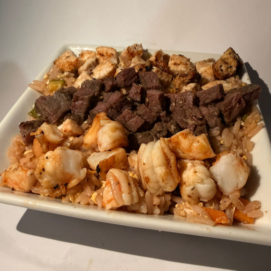 Arroz frito con pollo, arrachera y camarón, calabaza italiana, zanahoria y huevo.