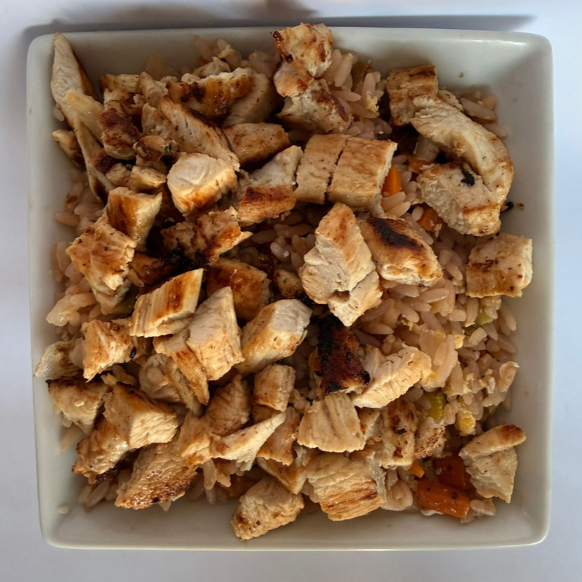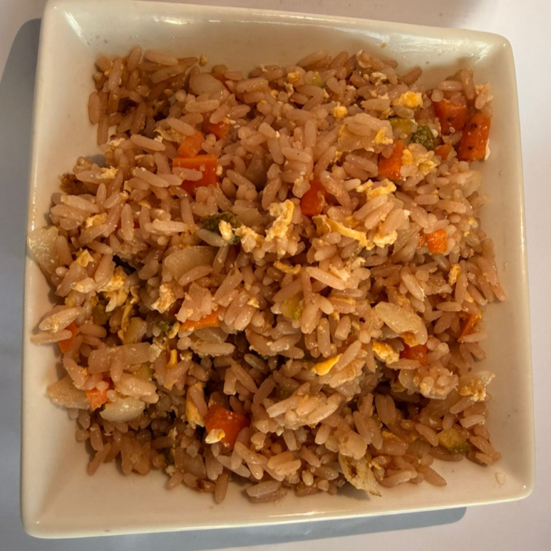 Arroz frito con pollo, calabaza italiana, zanahoria, huevo salteado y cebolla.