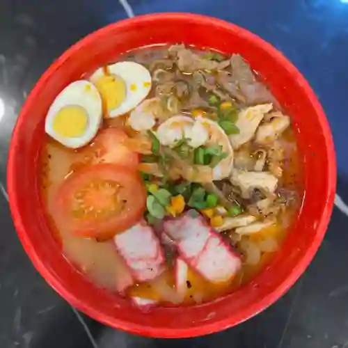 Ramen acompañado de camarón, pollo, cerdo, res, naruto, shitake, zanahoria, chícharo, huevo y elote.