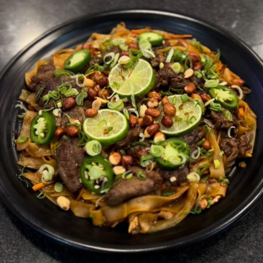 Deliciosa fusión asiática que combina los fideos salteados al estilo japonés con los sabores agridulces y ligeramente picantes del clásico pad thai tailandés. lleva res, cacahuate, limón, col, salsa de tamarindo picante y chile serrano.