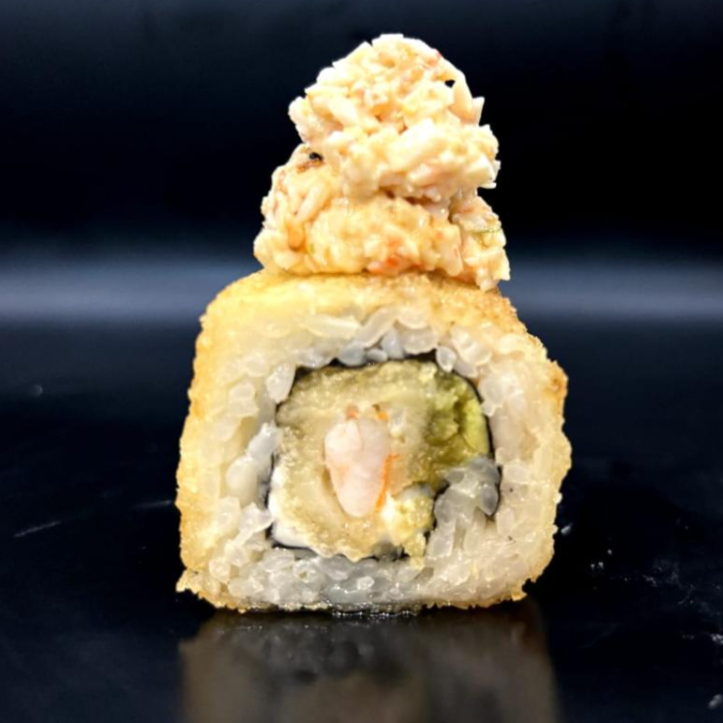 Rollo relleno de pepino, aguacate, philadelphia, encima lleva camarón empanizado, salsa spicy, salsa de anguila y ajonjolí.