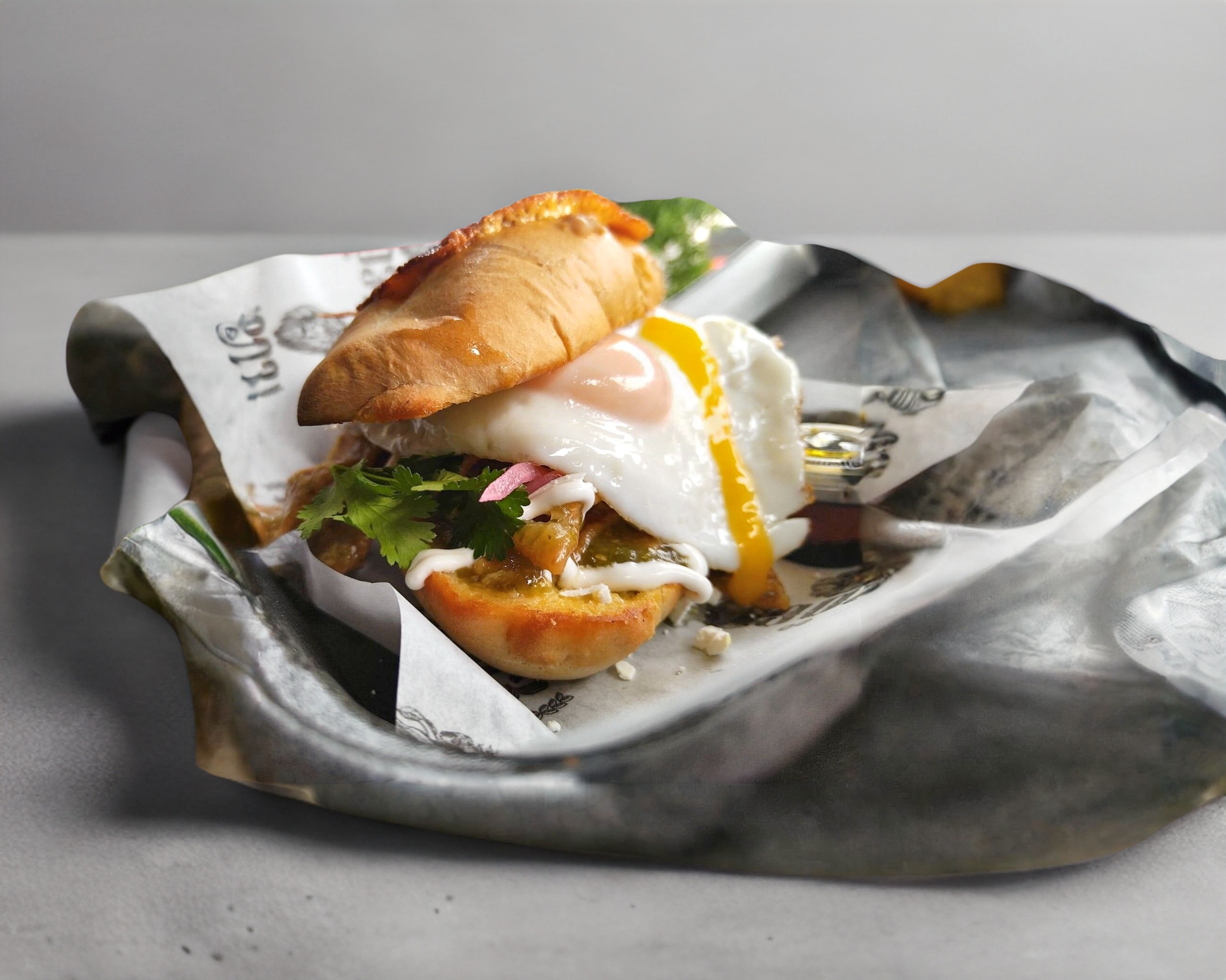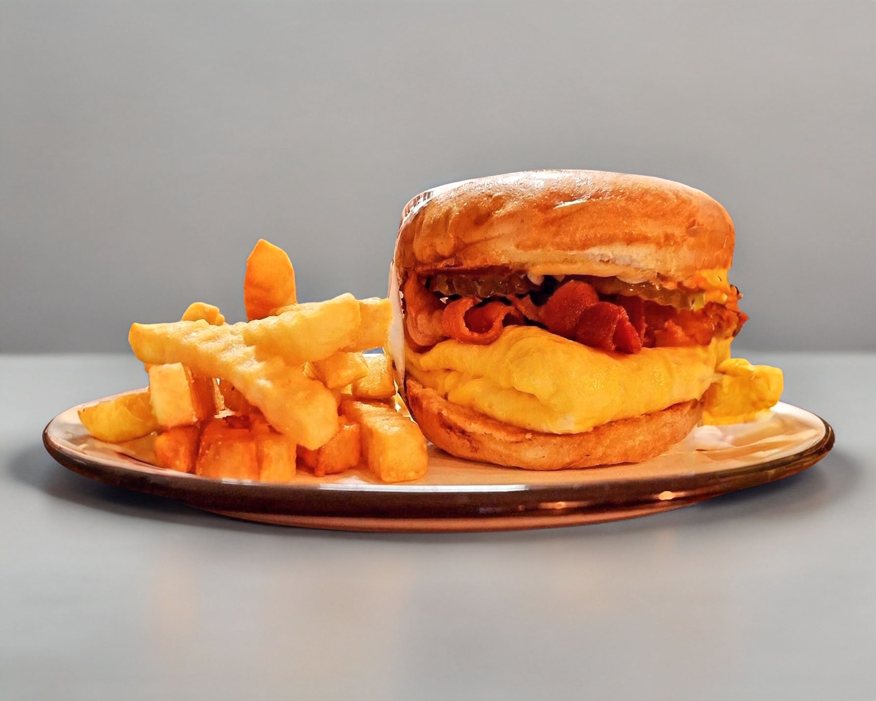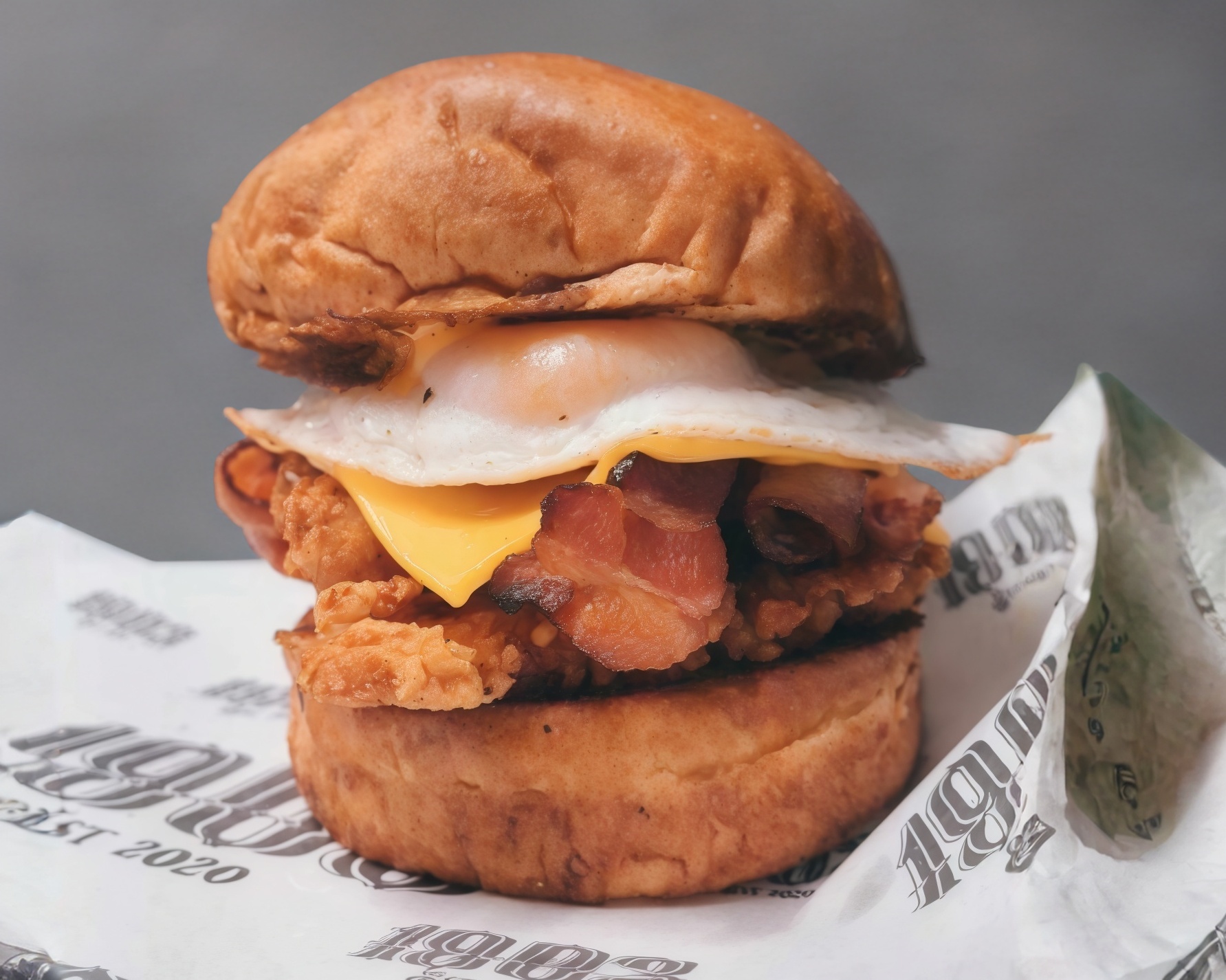 Tender de pollo, tocino, queso cheddar, huevo estrellado.
