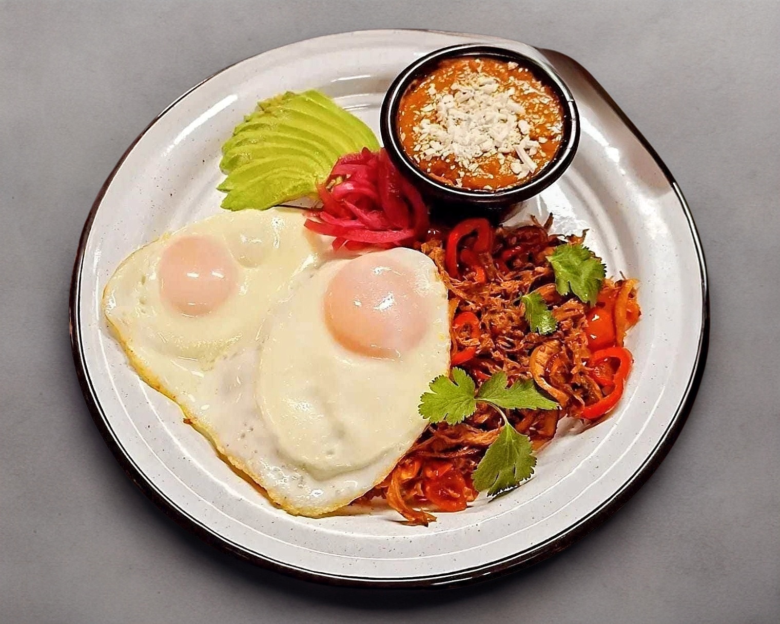 Carne deshebrada de res con verdura, 2 pz de huevo al gusto, frijoles, aguacate, cebolla curtida y 3 tortillas de maíz.