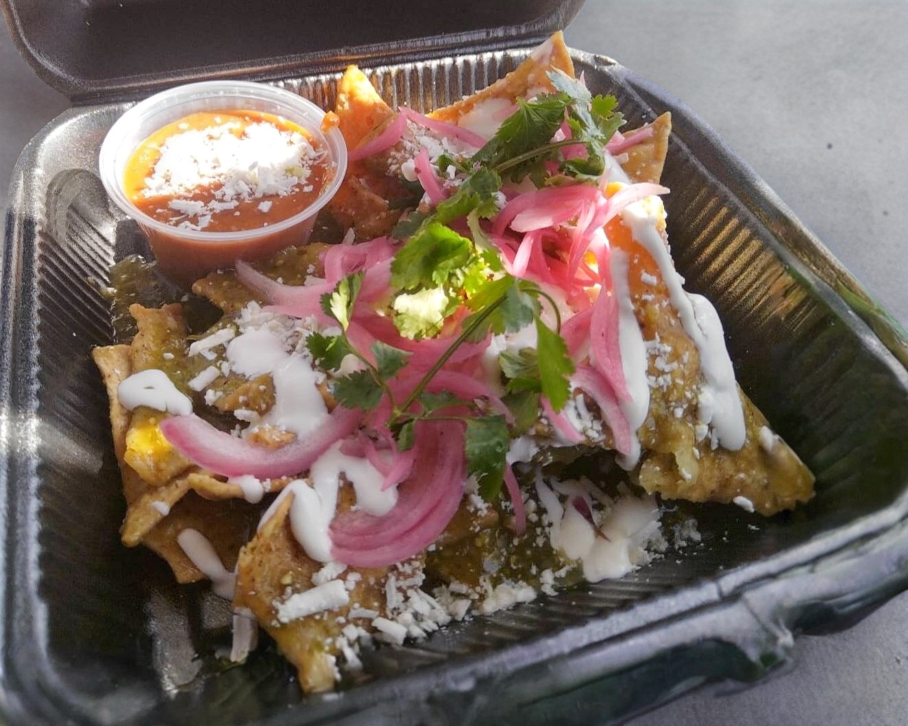 Crema, cebolla morada, cotija, cilantro y frijol.