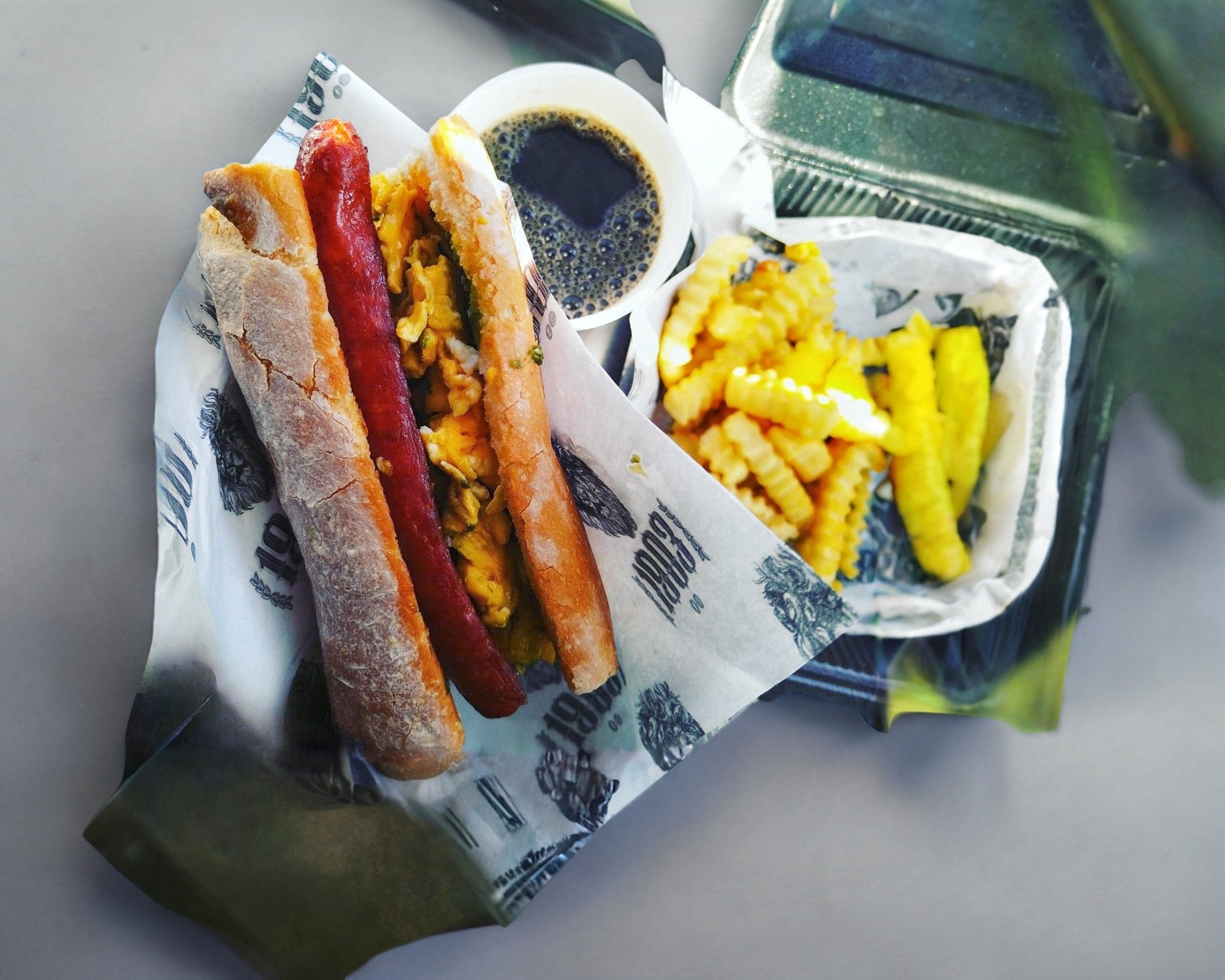 Sándwich en pan baguette, chorizo entero, 2 huevos revueltos, papas fritas.