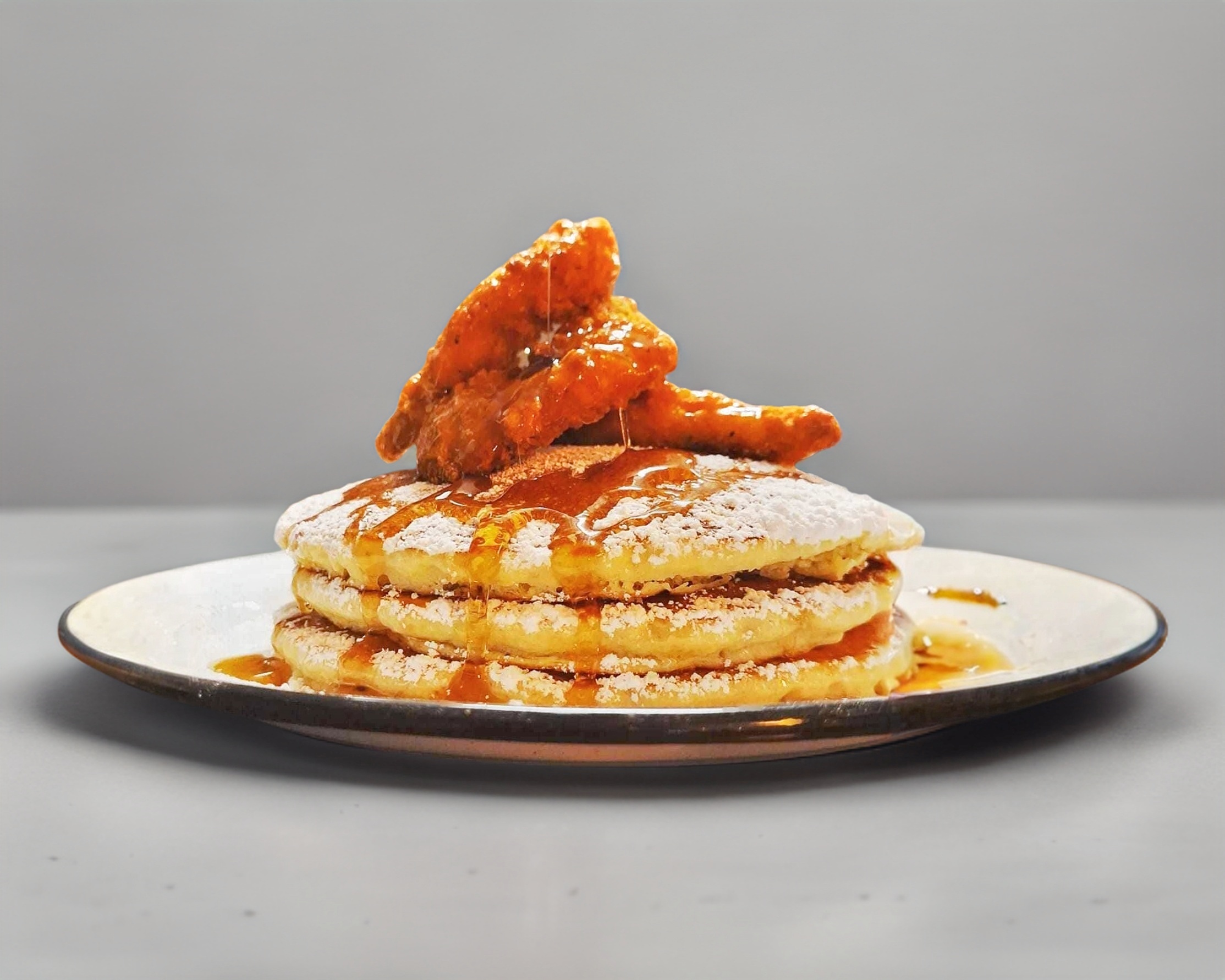 3 pz de Hotcake con Tender de pollo frito. Espolvoreado con azucar Glass y miel de maple.
