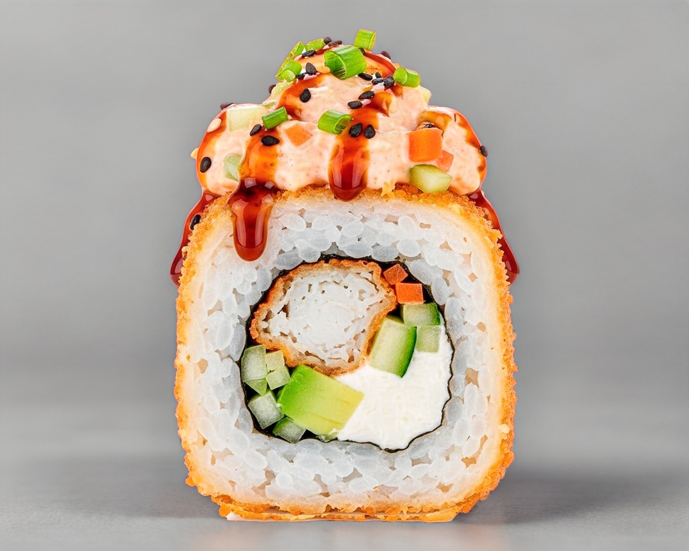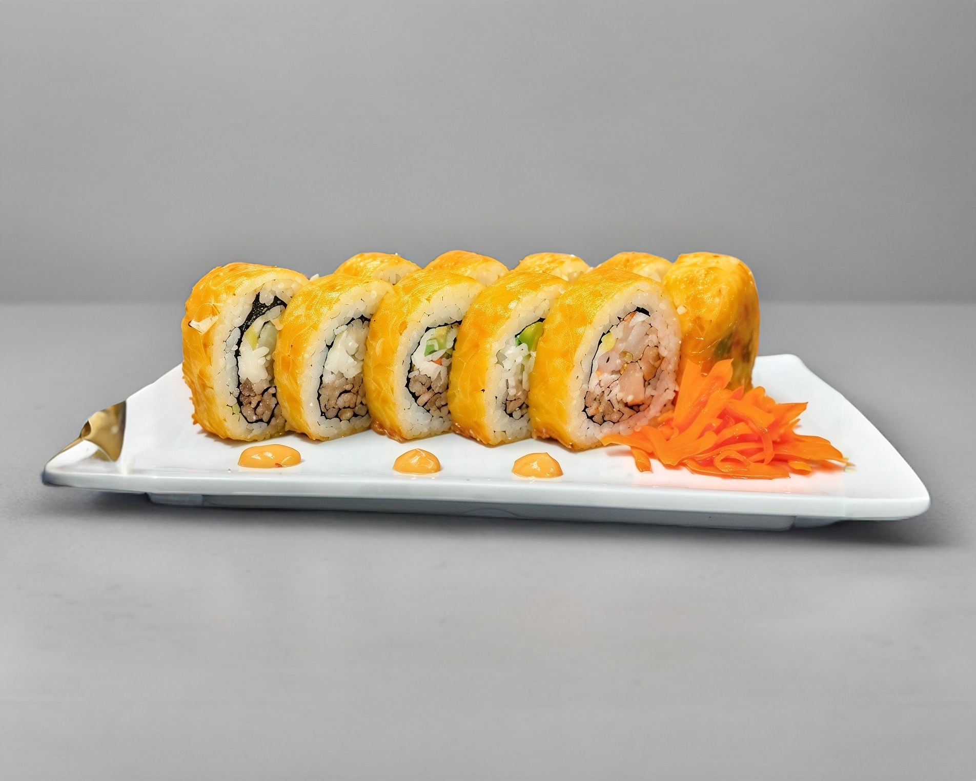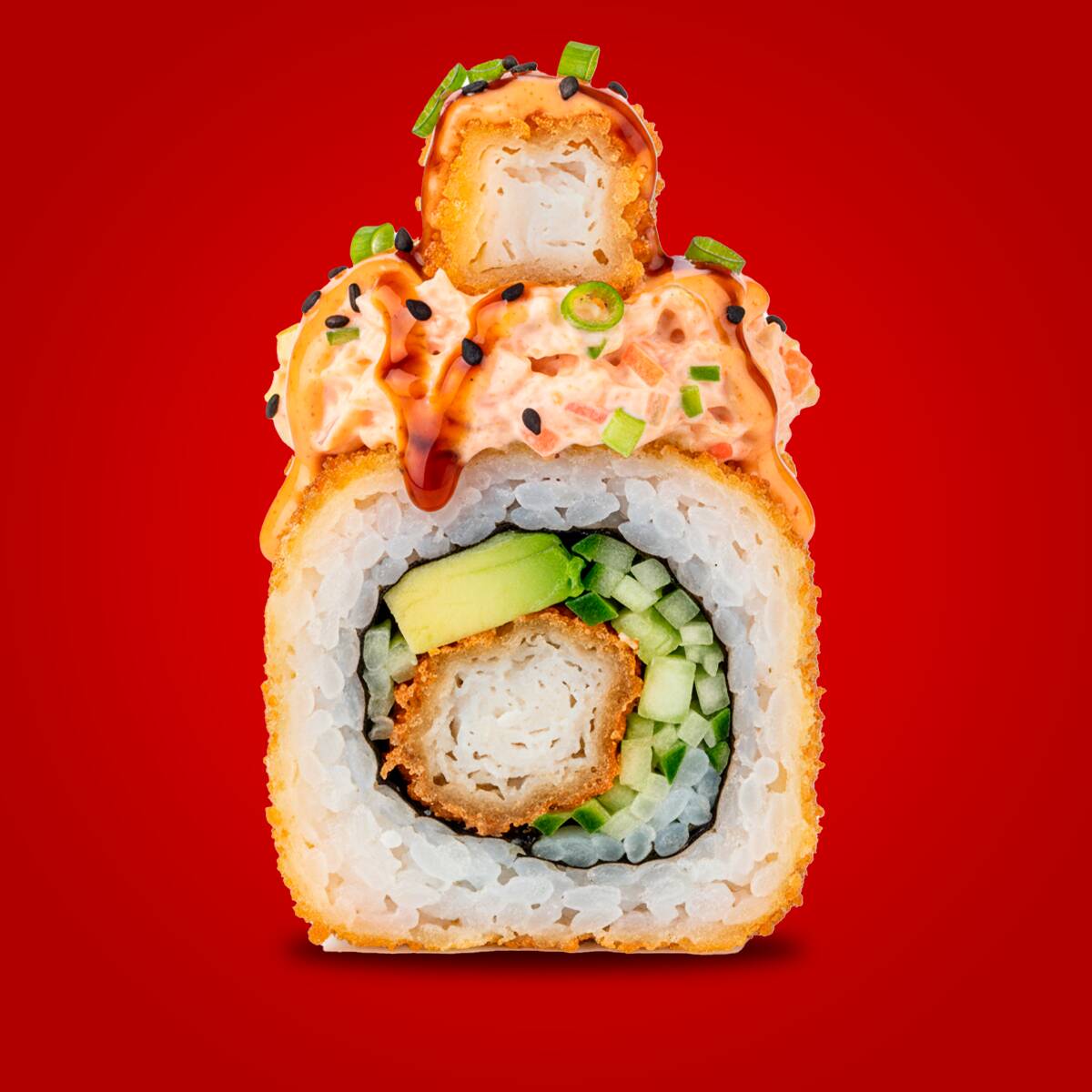 Crujiente por fuera, explosivo por dentro. Relleno de cangrejo crujiente, camarón, aguacate y pepino, cubierto con surimi empanizado, aderezo chipotle cremoso y un toque de salsa de anguila deliciosa, con una pequeña porción de tampico. ¡Cada rollo es una explosión de sabor!