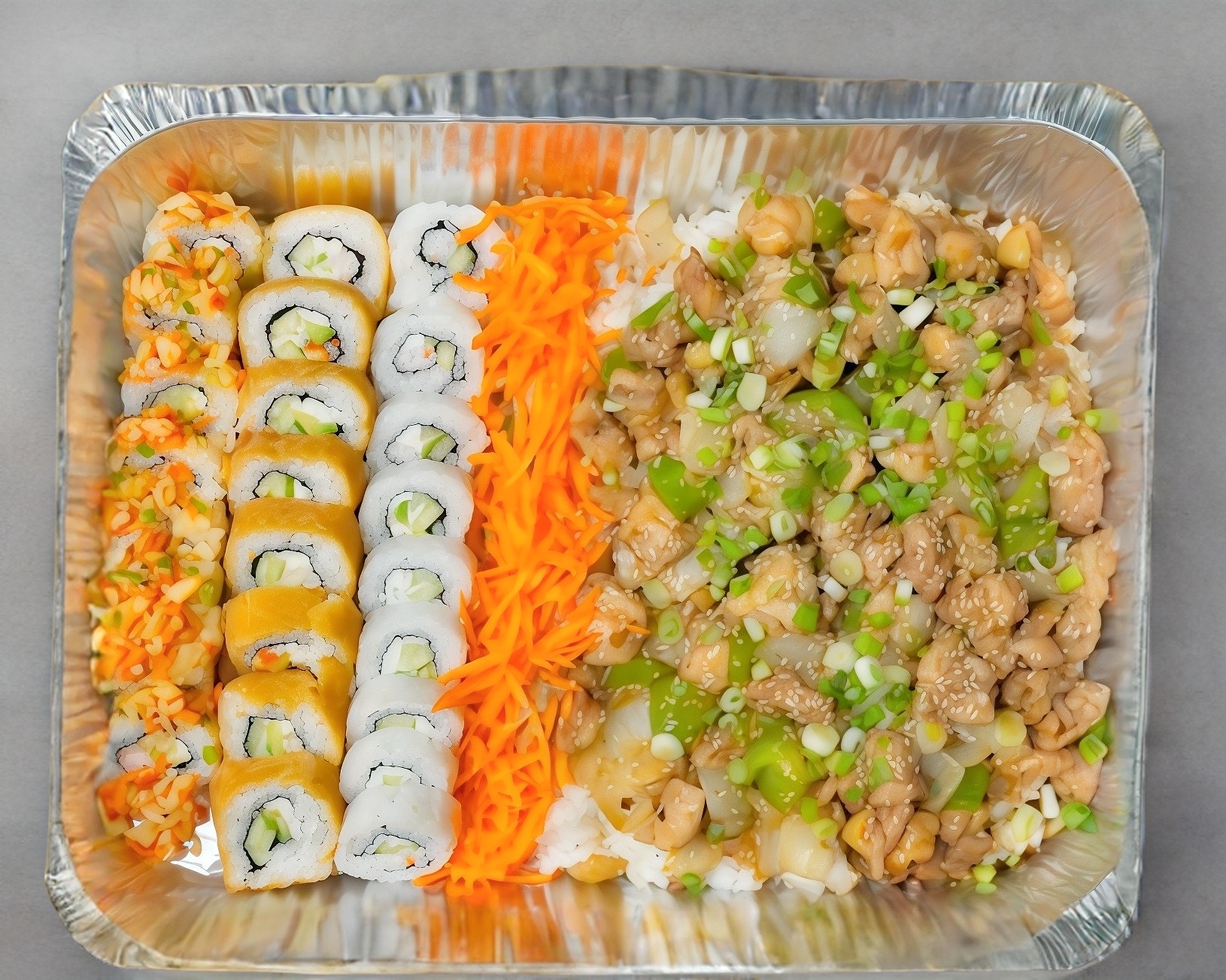 Nuestra Charola Deluxe es una mezcla de exquisitos sabores en una misma charola. Disfruta de 2 de nuestros rollos más pedidos: Cielo Mar y Tierra y de nuestro Culichi Roll cubierto de aguacate con el tradicional topping de tampico, 2 Sushi Bolas con la proteína a elegir, Orden Personal de Camarones Empanizados rellenos de queso crema (4pz), Porción de Teriyaki de Pollo salteado en verduras y arroz