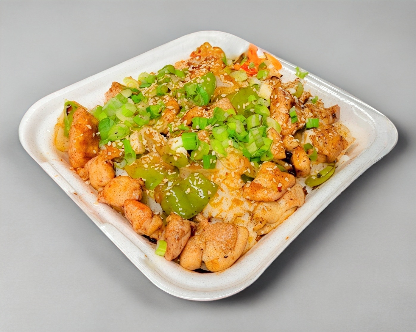 Delicioso teriyaki de pollo bañado en nuestras salsas de la casa sobre una cama de arroz acompañado de verduras mixtas