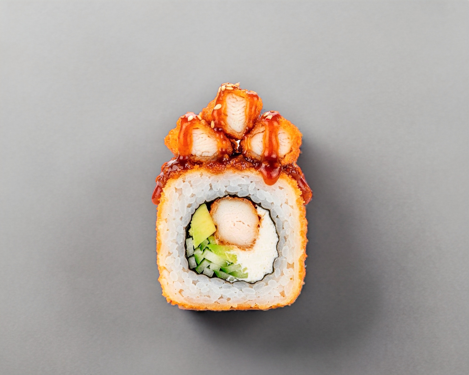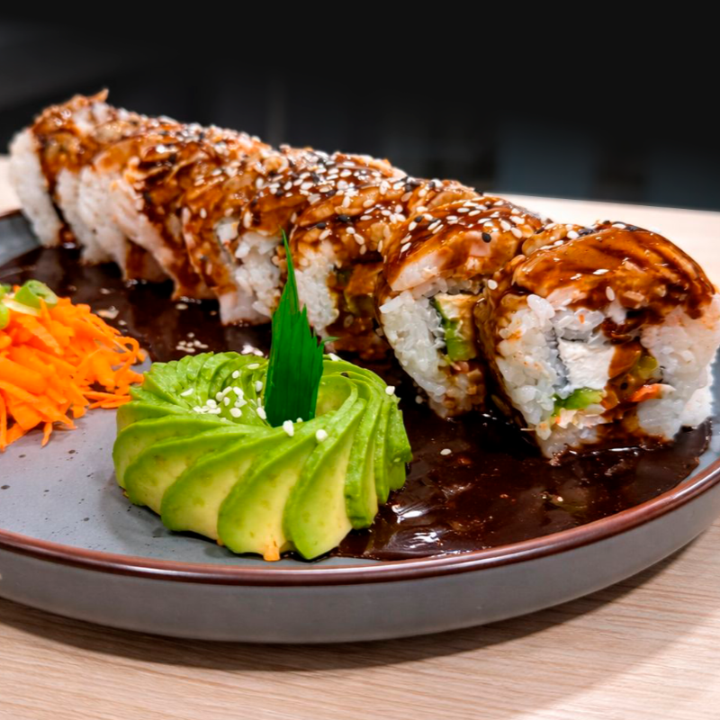Crujiente por fuera, jugoso por dentro. Relleno de pollo, aguacate, pepino y queso crema, cubierto con irresistible topping de pollo bañado en salsa teriyaki crunch.