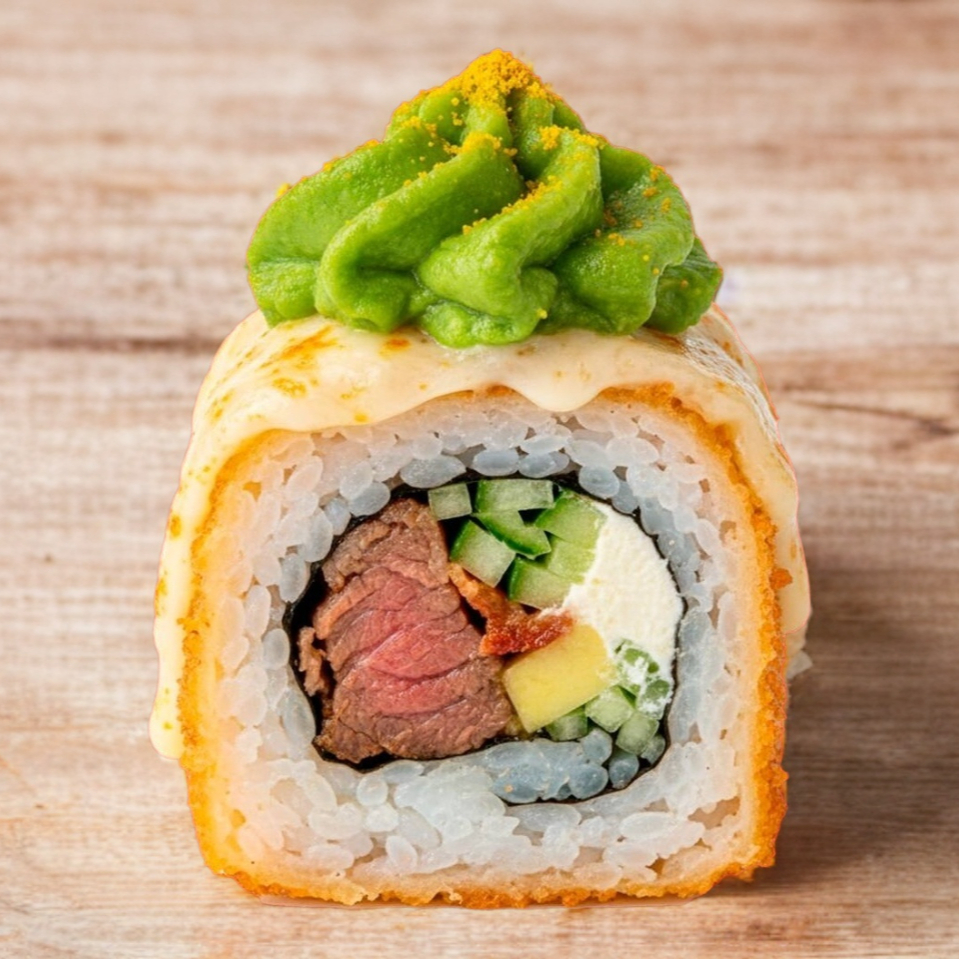 Un rollo empanizado y dorado a la perfección, coronado con abundante queso Monterrey derretido que se escurre provocativamente. Por dentro, la combinación irresistible de res jugosa y tocino crujiente, complementada con la frescura del aguacate y el pepino. Finalizado con un topping cremoso de aguacate molido y un toque vibrante de chile caribe para un toque picante inigualable.