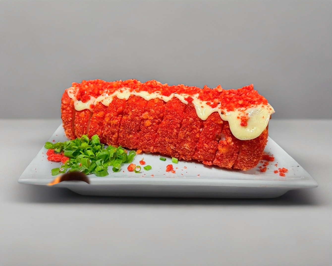 Takis® Roll es un rollo empanizado de Takis Fuego® relleno de alga, pollo, philadelphia, tocino, pepino y aguacate gratinado con nuestro queso especial con topping de takis®