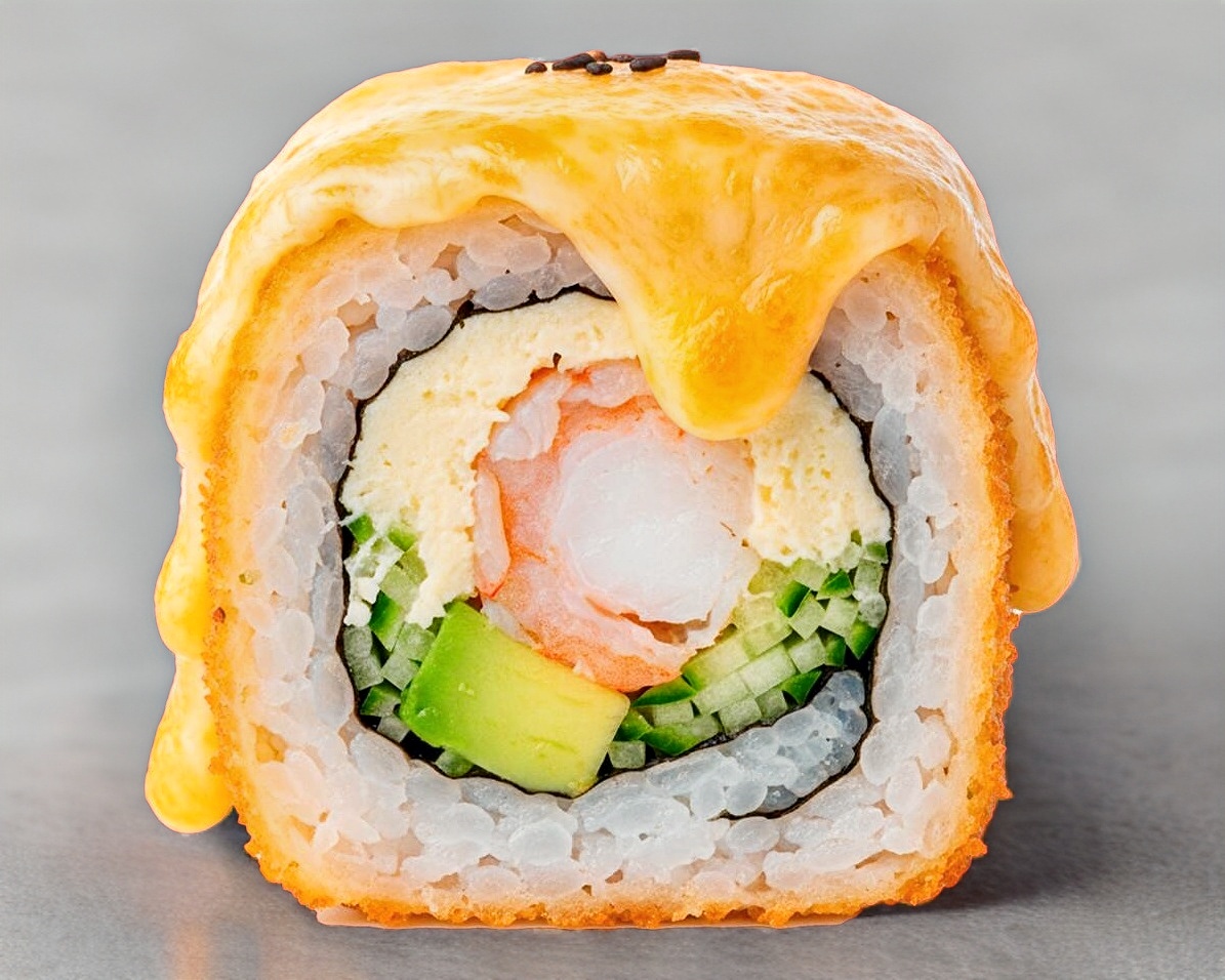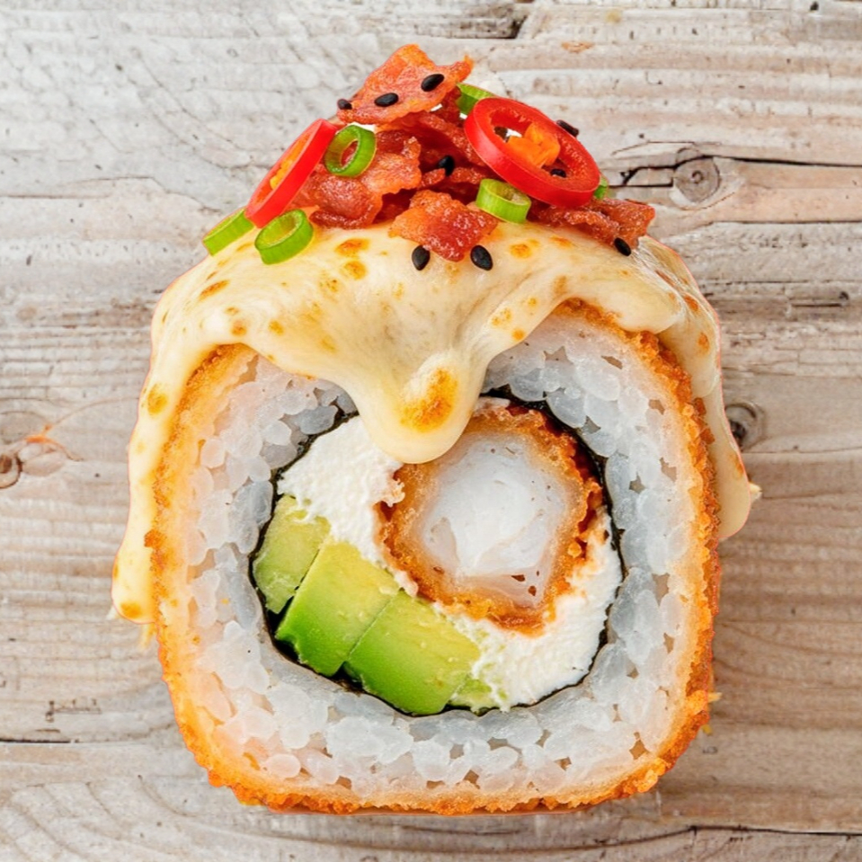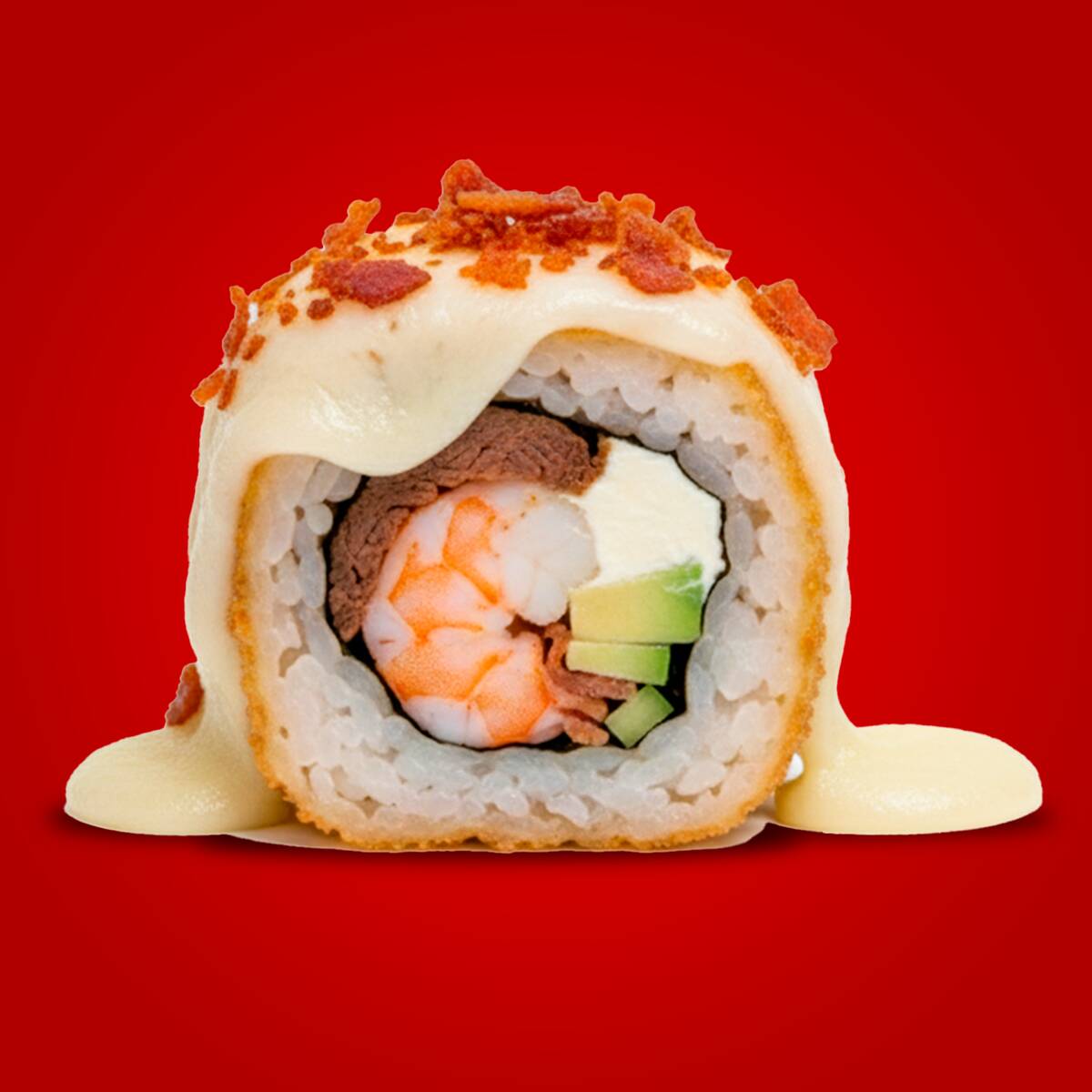 Un exquisito cilindro de arroz relleno, perfectamente empanizado hasta alcanzar un tono dorado y crujiente. Este rollo de autor envuelve una mezcla suculenta y audaz: camarón crujiente, tocino premium y rebanadas de aguacate cremoso, todo ligado por la suavidad del queso crema. Gratinado con queso asadero