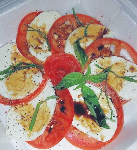 Rodajas de tomate, rodajas de queso mozzarella fresco, albahaca y nuestro aderezo de la casa.