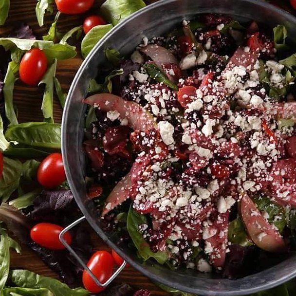 Lechuga mixta orgánica, espinacas, fresa, nuez caramelizada, arándanos, tomate cherry, queso felta, rajas de pera y aderezo vinagreta.