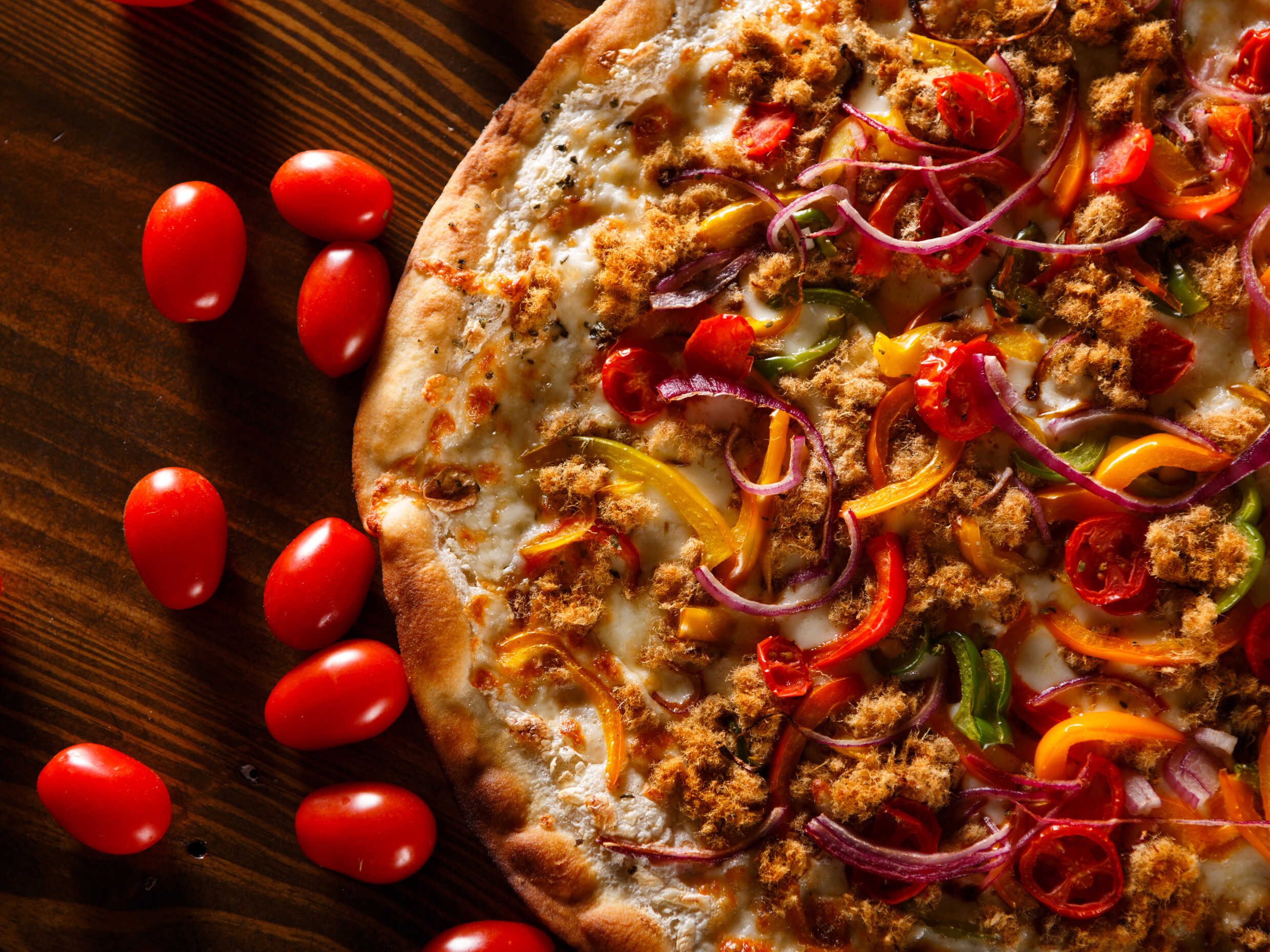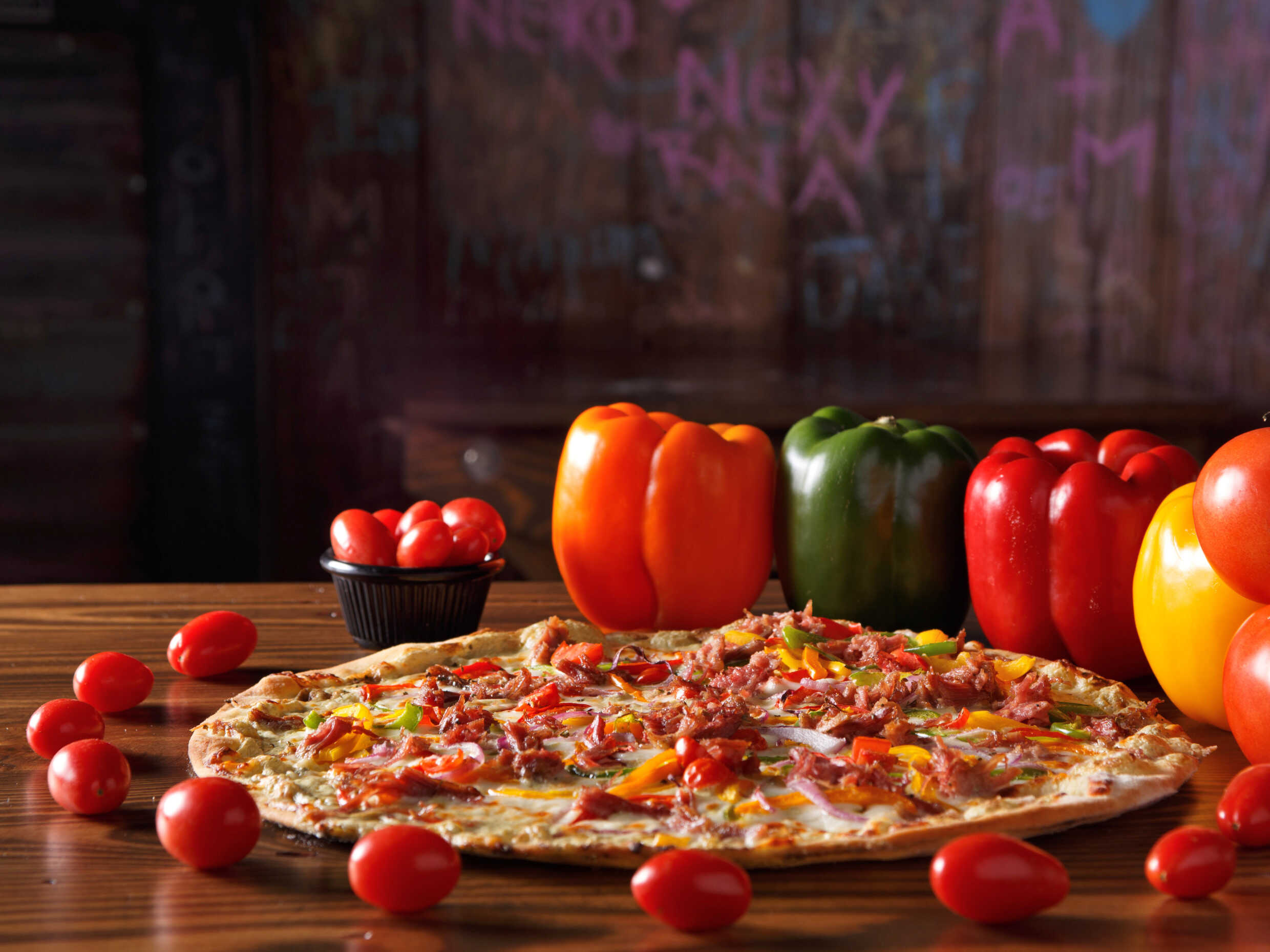 Elige el tamaño. Salsa de ajo rostizado, queso mozzarella, machaca sonorense, morrones de colores salteados, cebolla morada, tomate cherry y orégano.