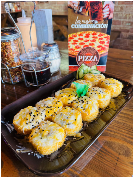 Alga por fuera empanizado, salmon ahumado, camaron y queso philadelphia por dentro, arriba una pasta especial elaborada con cangrejo y atun spacy.