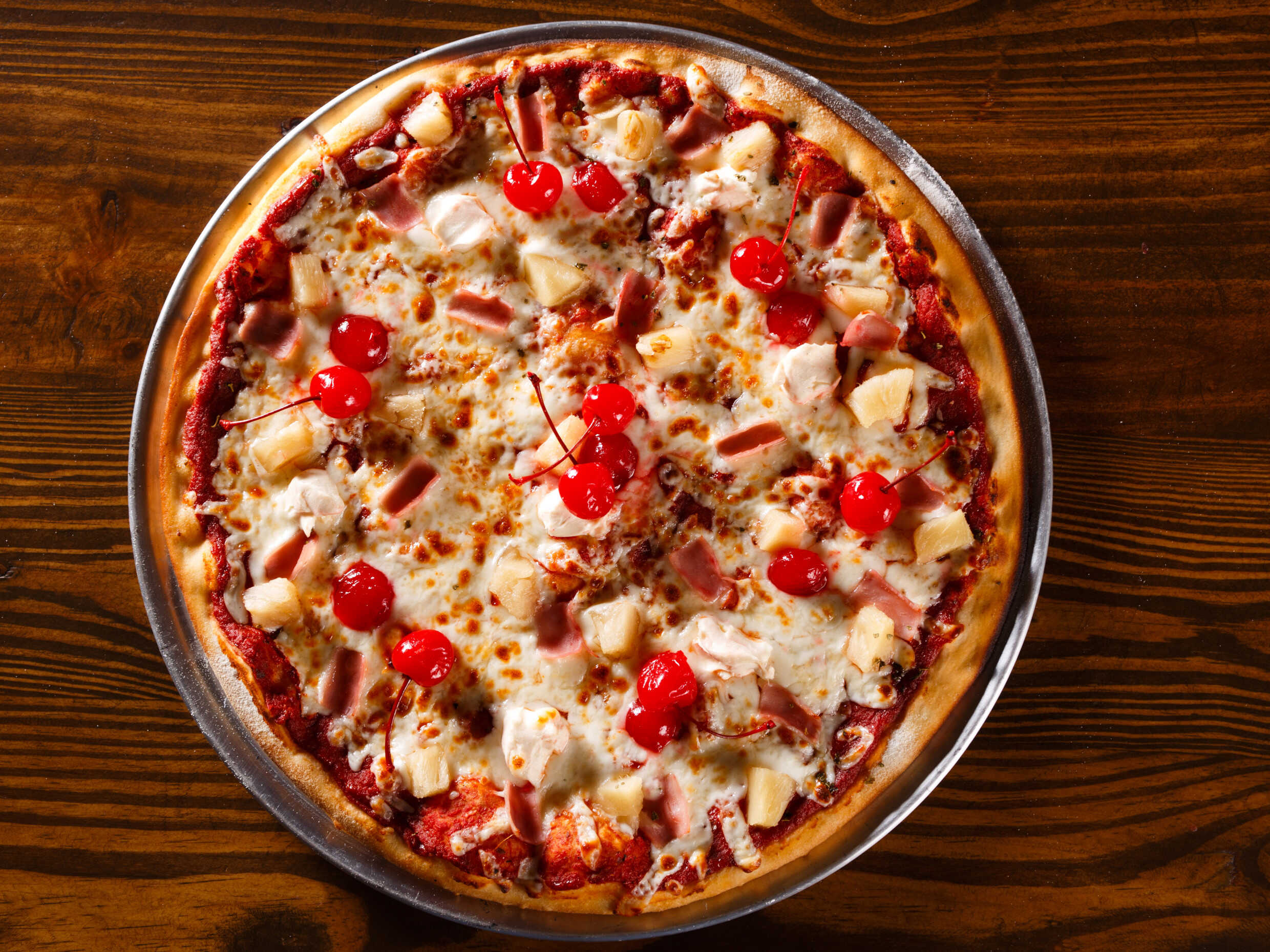 Salsa de tomate, queso mozzarella, jamón, piña, cherry, queso Philadelphia y orégano.