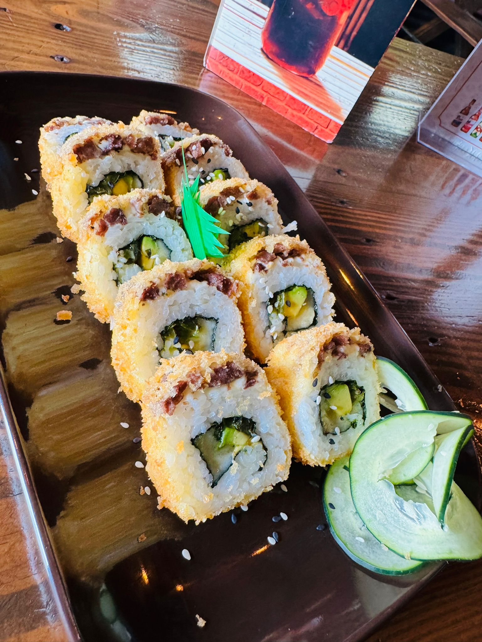 Alga por fuera, atun, pepino, sirasha y masago por fuera