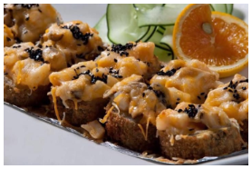 (Horneado) Alga por fuera empanizado, salmon ahumado, camaron y queso philadelphia por dentro, arriba una pasta especial elaborada con callo, shitake, cebolla, sirasha, arare, masago y se hornea con 3 quesos.