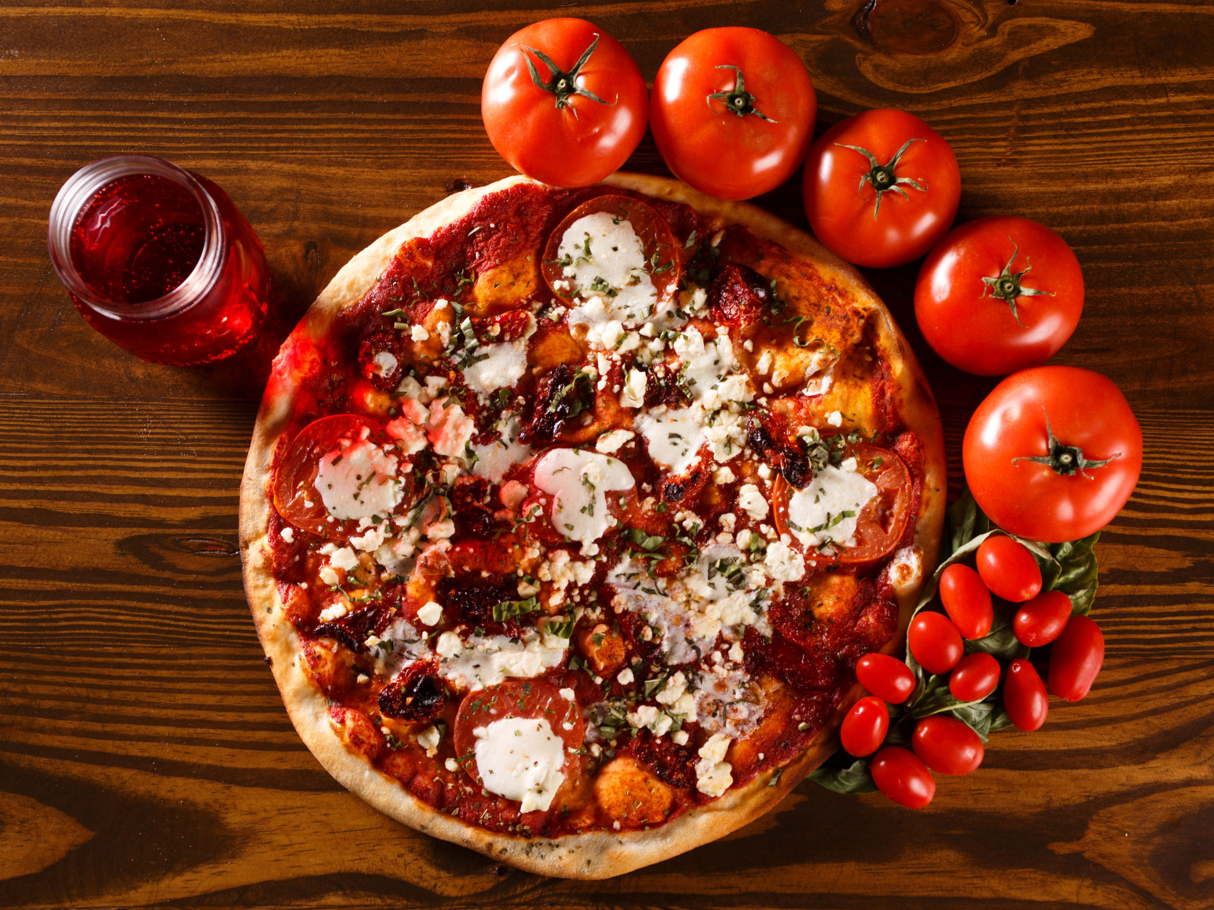 Elige el tamaño. Salsa de tomate, queso mozzarella ,rodajas de tomate, albahaca, tomate deshidratado, queso de cabra y orégano.