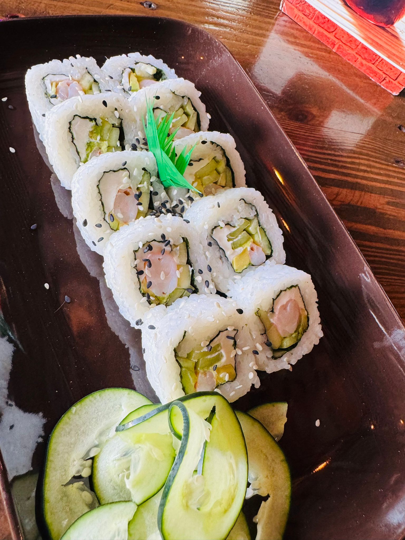 Forrado de aguacate, pepino, queso, aguacate y camaron por dentro