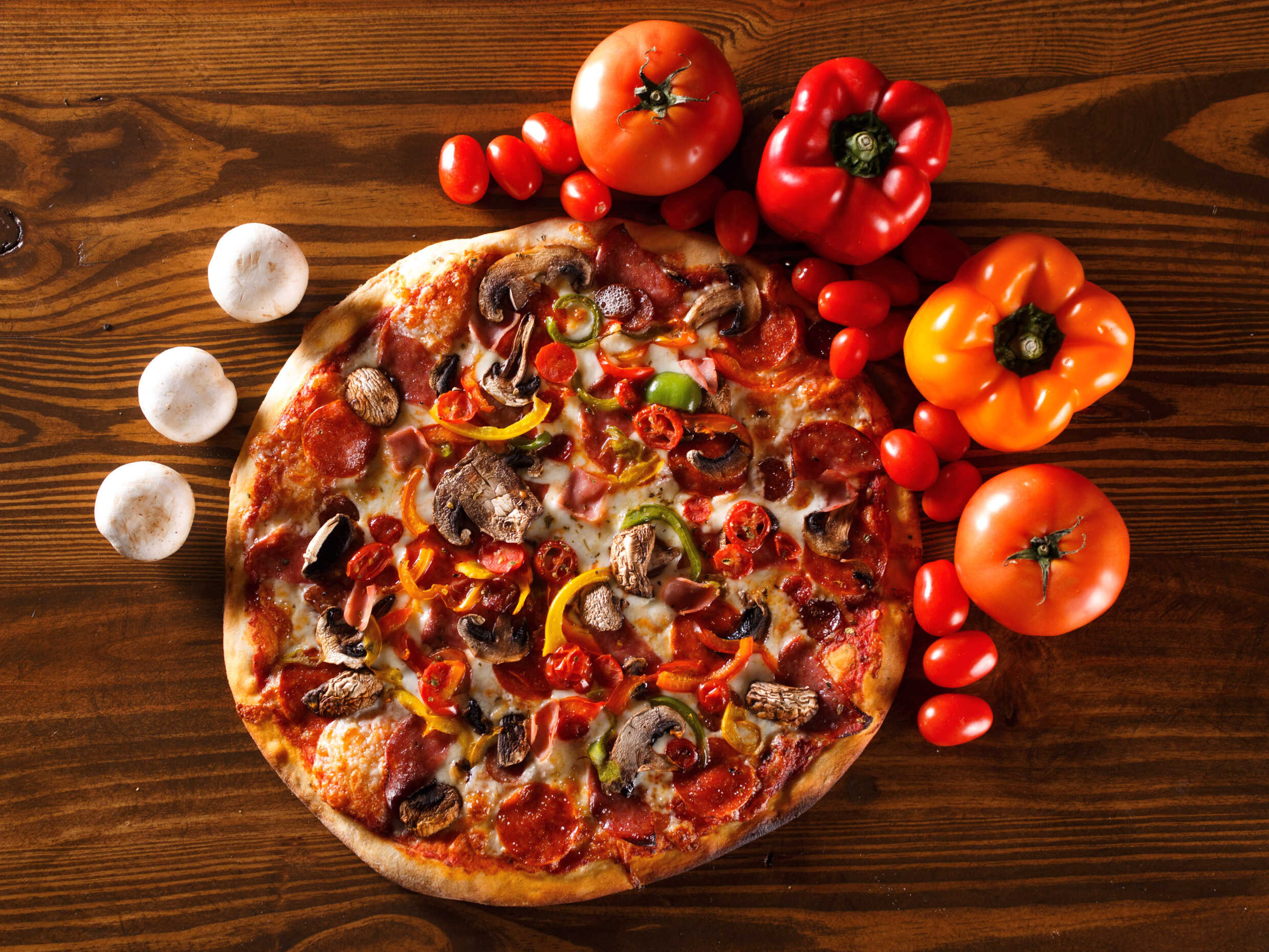 Elige el tamaño. Salsa de tomate, queso mozzarella, pepperoni, jamón, salchicha italiana, salami, morrones de colores, cebolla morada, champiñones, aceitunas negras, tomate cherry y orégano.