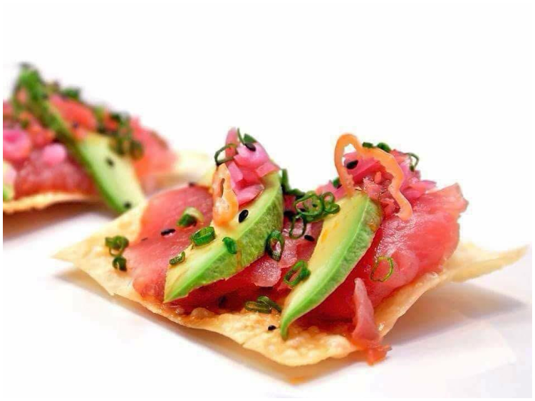 Pasta de atun, toque de ajonjoli, rayu, soya, limon, cebolla morada y masago, con una pizca de chile habanero