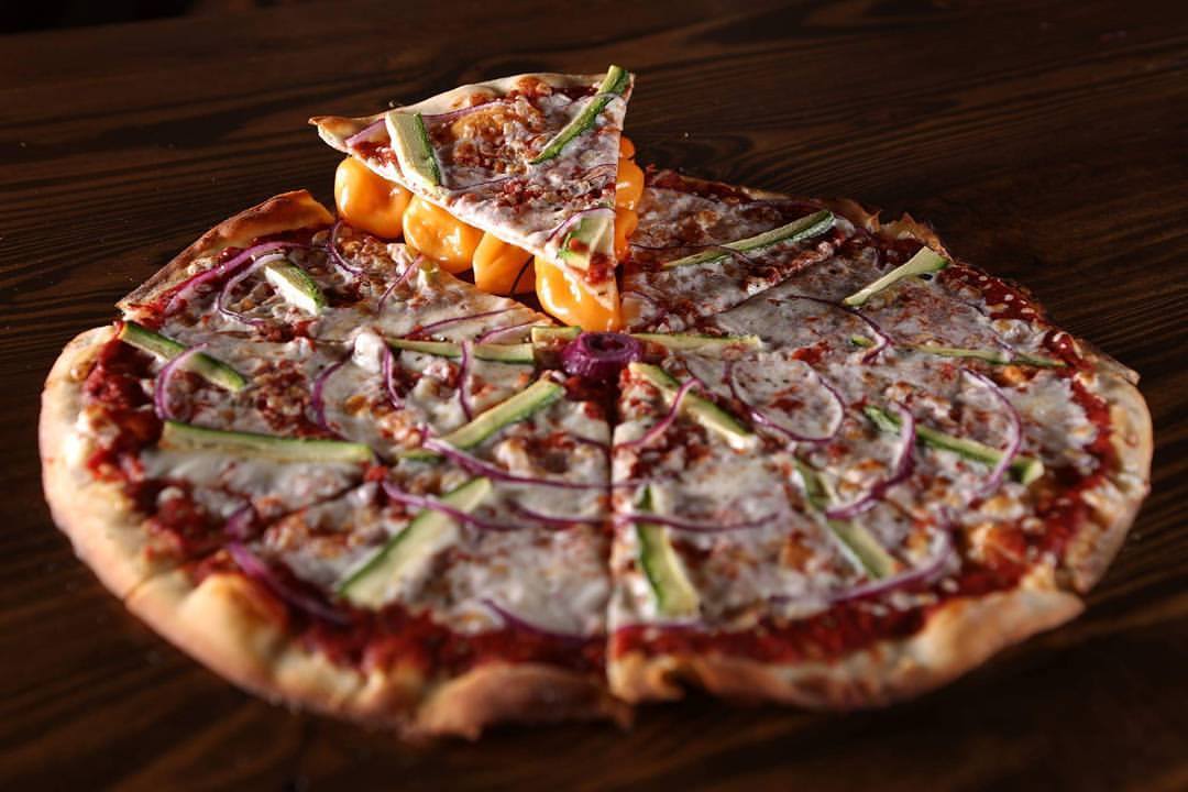 Elige el tamaño. Salsa de tomate, queso mozzarella, calabacita, cebolla morada y chile habanero escondido en un pedazo de pizza.