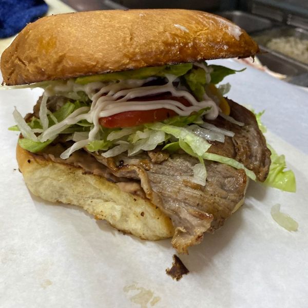 Carne, 2 quesos, carne asada, tocino, guacamole, jalapeño, lechuga, tomate, pepinillos, cebolla y aderezos. + Soda Pepsi a elegir