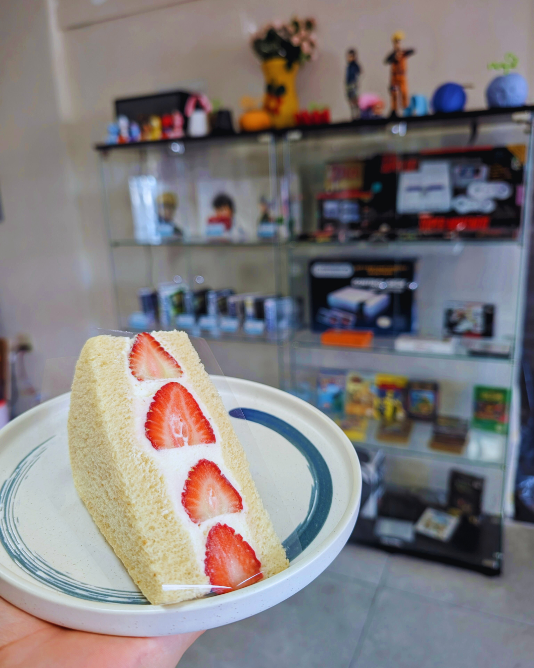 Sándwich de pan blanco relleno de crema con una combinación de frutas.
