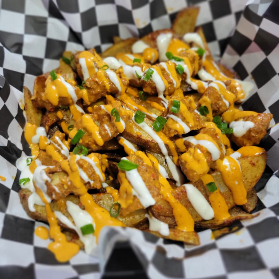 Cama de papas sazonadas acompañada de boneless bufalo con ranch y chipotle