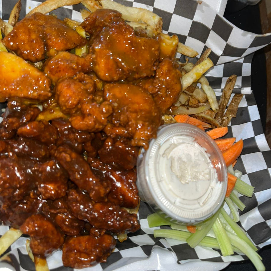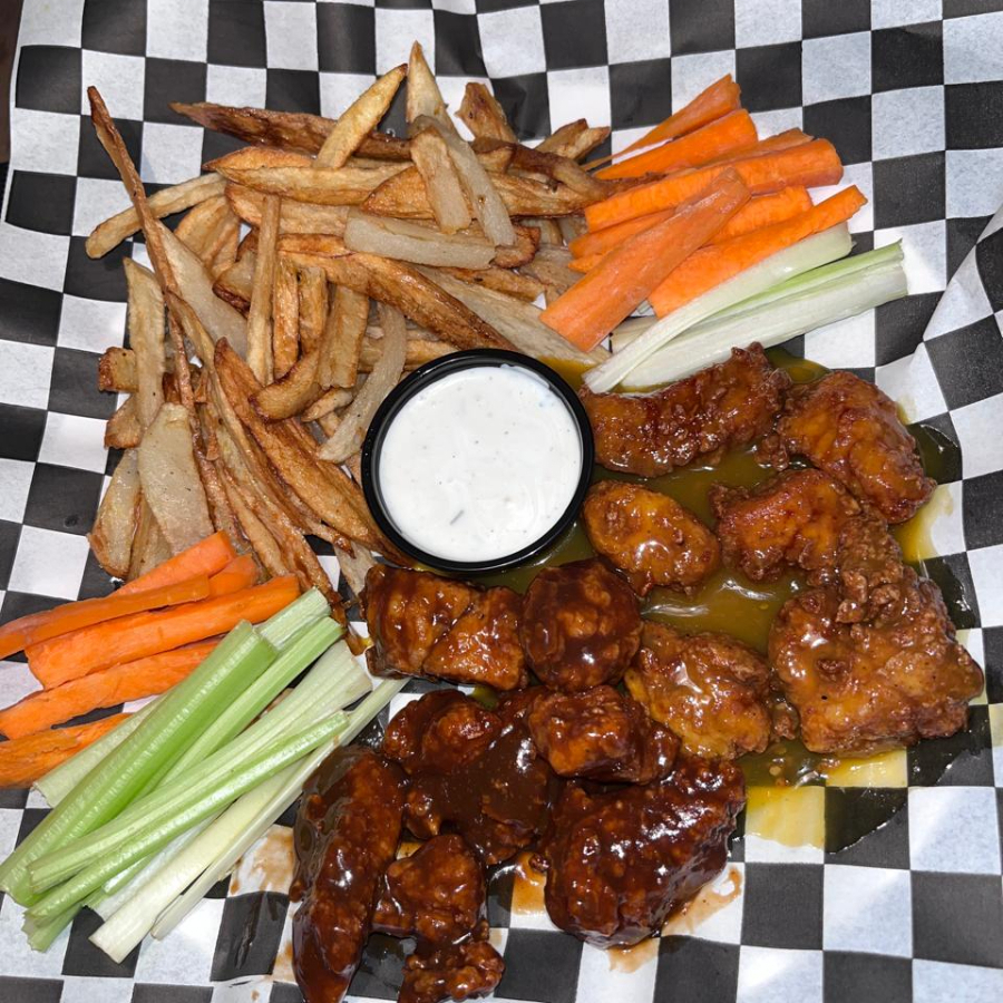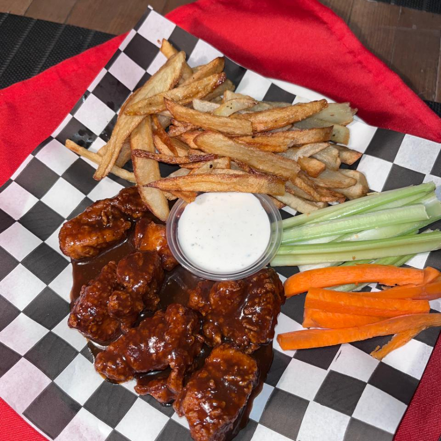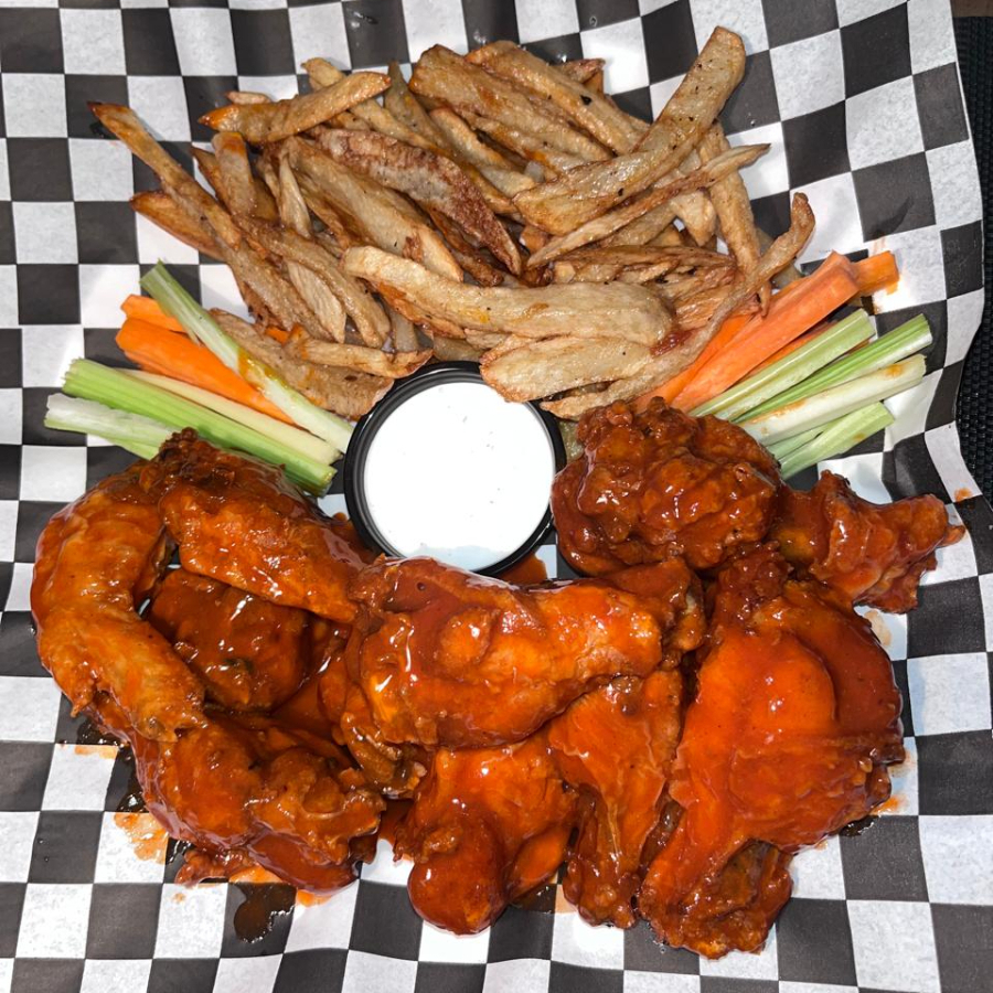 Alitas fritas bañadas en salsa de tu eleccion con porcion de papas,apio, zanahoria y adereso ranch.