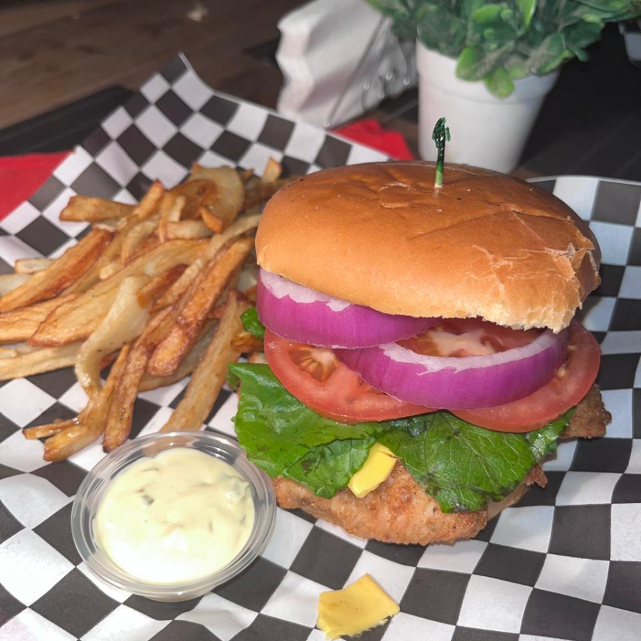 Pechuga empanizada, lechuga, jitomate, cebolla, mayonesa, catsup y mostaza. Incluye papas y aderezo de la casa.