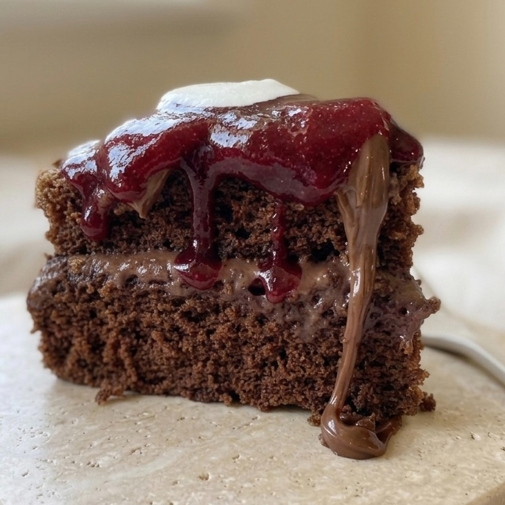 Pastel humedo de chocolate con vino tinto, relleno de brigadeiro de chocolate oscuro y compota de frutos rojos, vino tinto y un toque de naranja