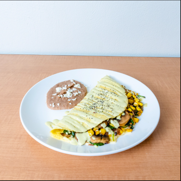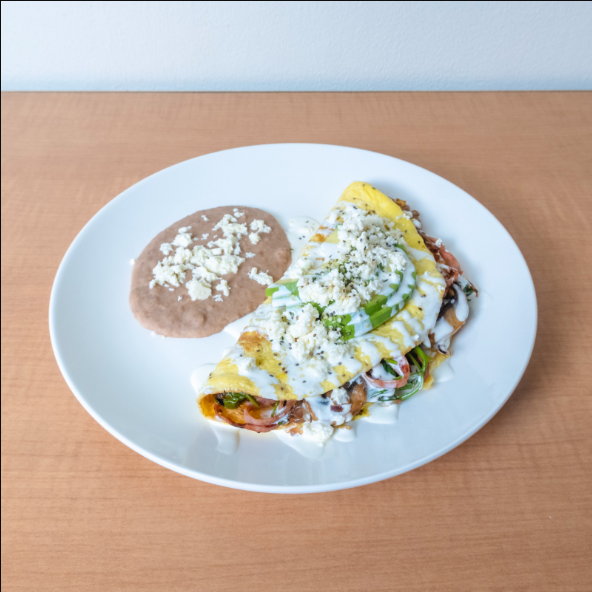 Aguacate, crema, cebolla morada, cilantro y queso fresco, acompañado de frijoles refritos en manteca de coco.