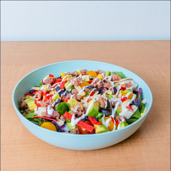 Lechugas mixtas, pechuga de pollo, cebolla morada, tomate cherry, elote amarillo, aguacate, tortillas fritas, bacon bits, aderezo ranch.