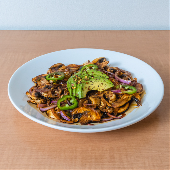 Champiñón, cebolla morada, limón, salsas negras, chile quebrado, aguacate y pepino persa.