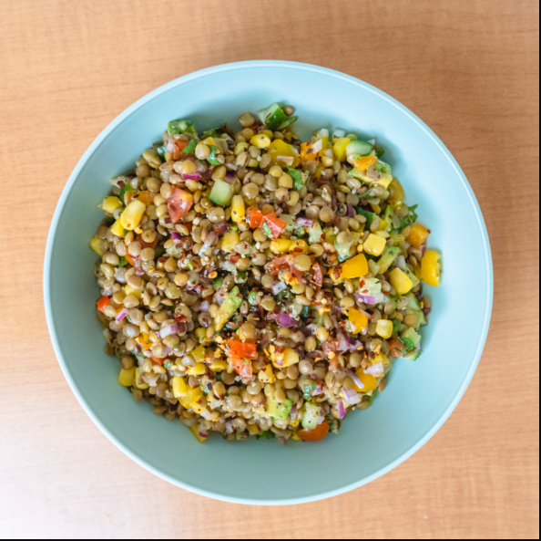 Lentejas, elote amarillo, pimientos, tomate cherry, pepino persa, cebolla morada, cilantro, aguacate, chile quebrado, limón y aderezo italiano.