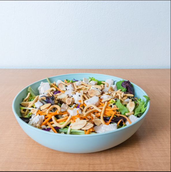 Lechugas mixtas, pechuga de pollo, col morada, zanahoria, calabaza, chow mein noodles, almendras tostada, ajonjolí negro, aderezo oriental.