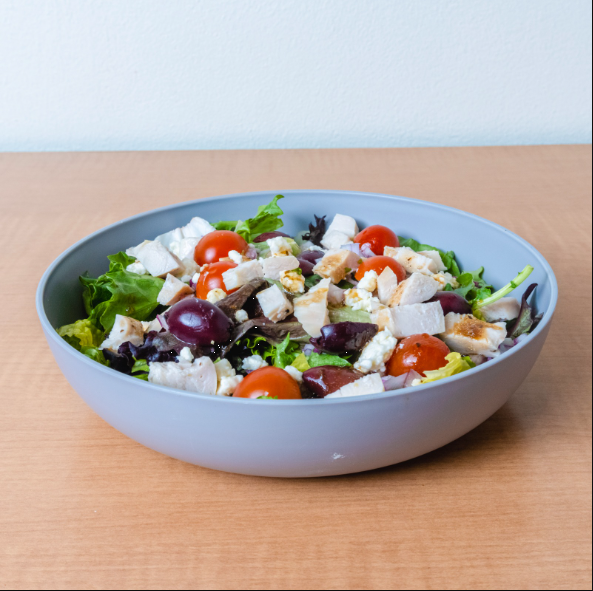 Lechugas mixtas, pechuga de pollo, cebolla morada, tomate cherry, pepino persa, aceituna kalamata, queso feta, vinagreta balsámica.