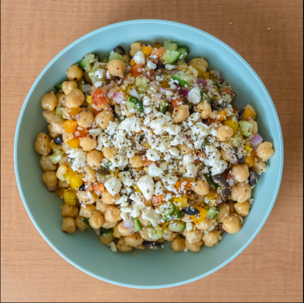 Garbanzo, quinoa, pimientos, tomate cherry, pepino persa, cebolla morada, aceituna negra, queso feta, limón y aderezo italiano.