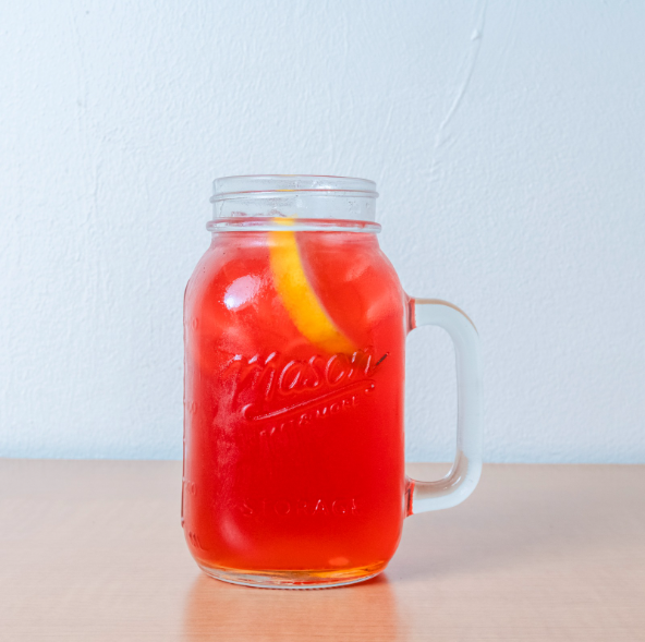 Infusión de té de jamaica, pétalos de rosa, cáscara de naranja y maracuyá, jarabe de durazno, limonada. 24 Oz