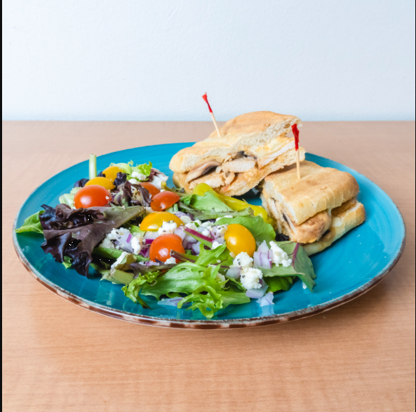 Pechuga de pollo, pesto de albahaca, espinaca, tomate y queso suizo americano.