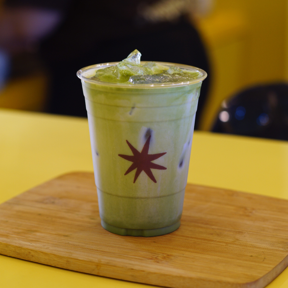 Matcha de grado ceremonial con un toque de miel de agave, servido con leche fría de tu elección y jarabe natural de plátano.