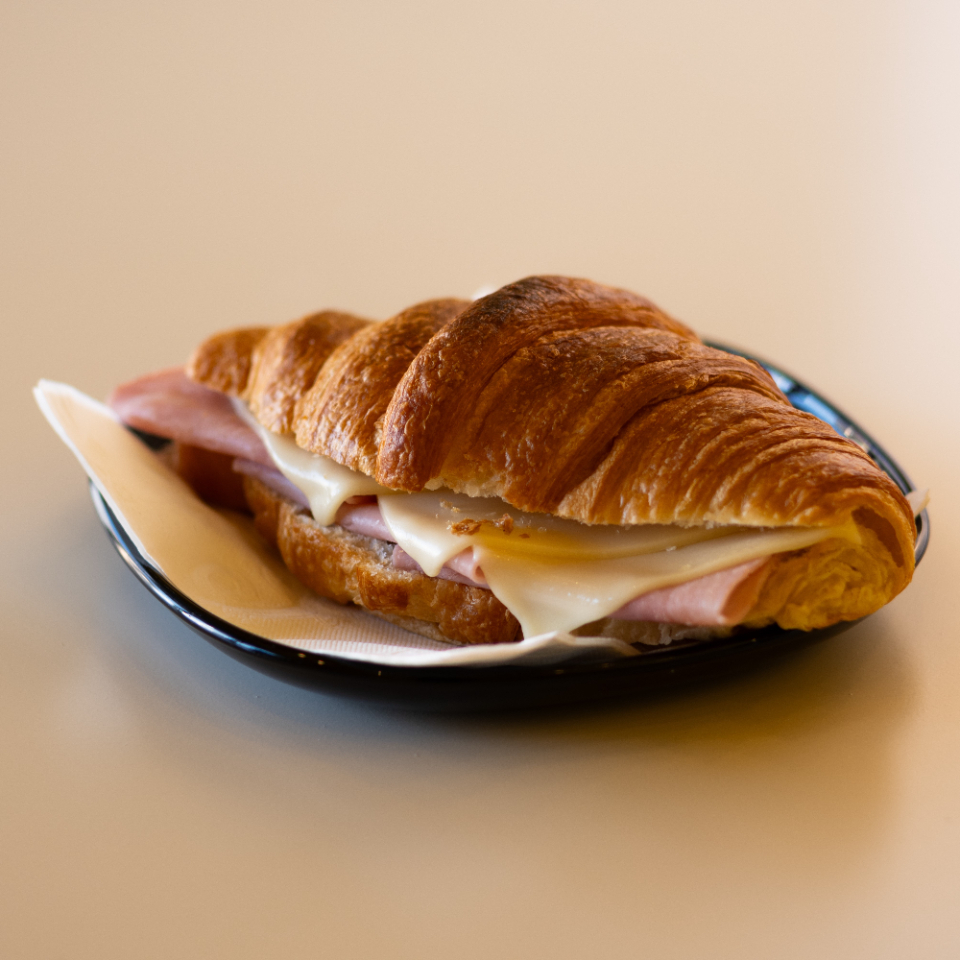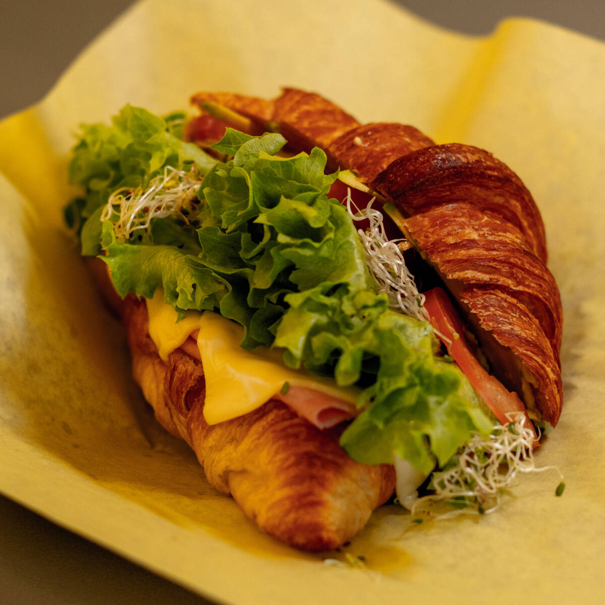 Croissant hojaldrado relleno de jamón, queso manchego, lechuga, tomate, alfalfa, aguacate, acompañado de chiles. Dorado, cálido y lleno de sabor.