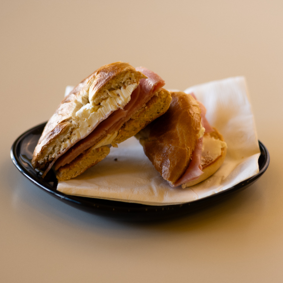 Bagel tostado con queso crema y jamón. Un bocado salado, suave y delicioso.