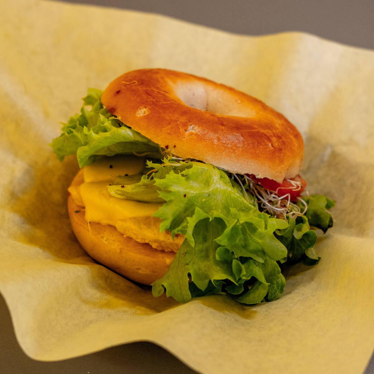 Bagel con pechuga de pollo, queso manchego, lechuga, alfalfa, tomate, aguacate y semillas de sesamo.