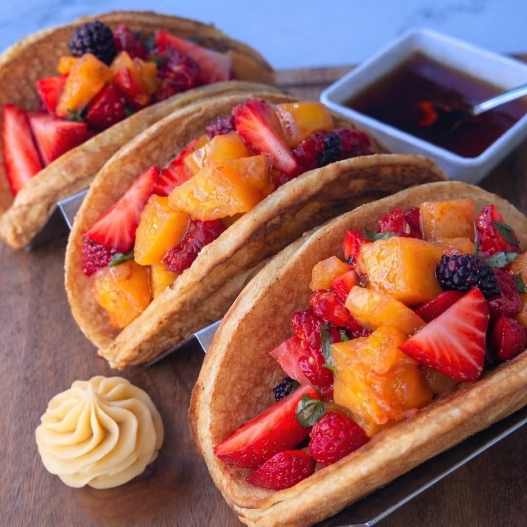 3 piezas de pancake en forma de taco, rellenos de mix de frutas, crema inglesa , mantequilla y miel maple.