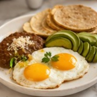Acompañadosde frijoles regritos, aguacate, toritlla de maiz, de harian o pan.